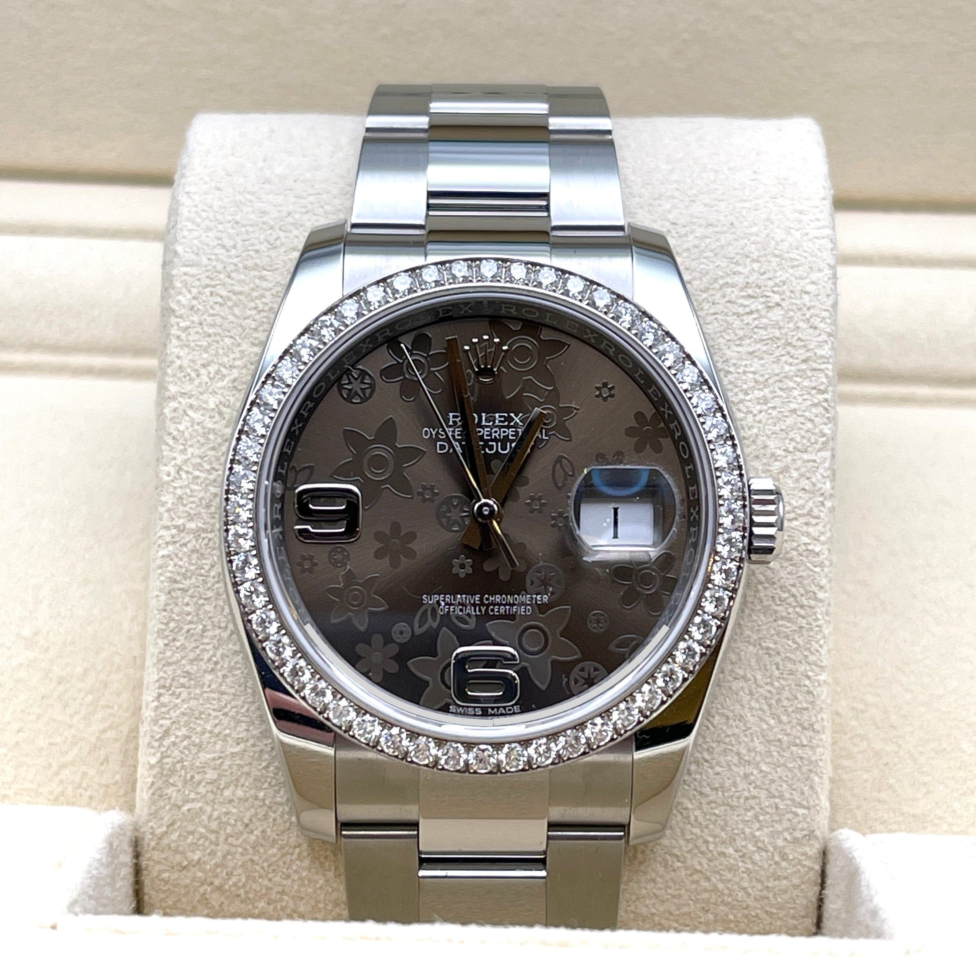 The 2025 Watch Datejust is crafted in a 36mm stainless steel case and comes on a traditional Oyster bracelet. The case has polished lugs and is hermetically sealed with a Twinlock waterproof screw-down crown. This timepiece features a magnificent diamond bezel set with 52 round-cut diamonds and a bronze floral motif dial that matches. This stunning Datejust will make a striking statement on any wrist. man or woman alike.