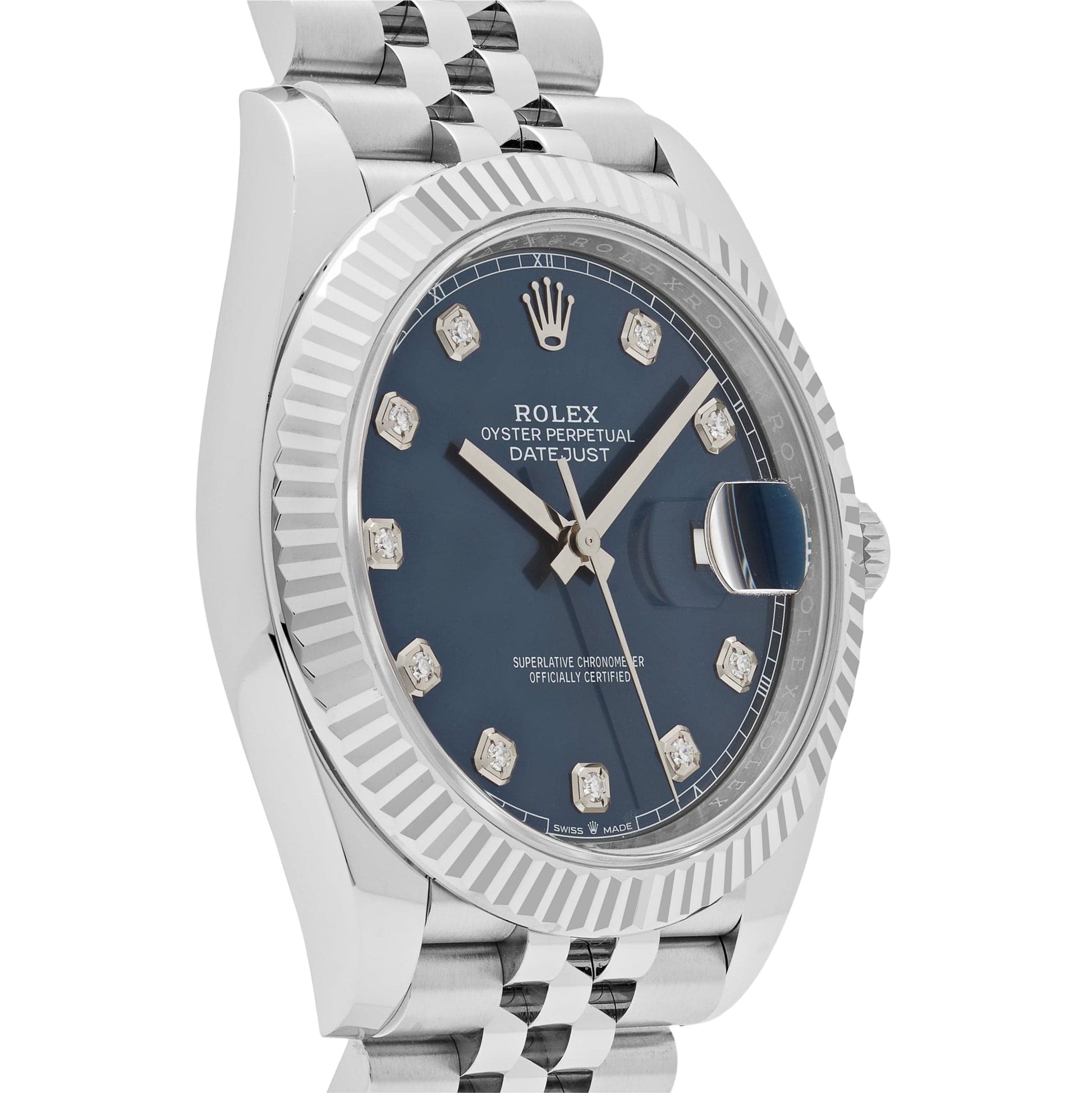 The 2025 Watch Datejust is designed with a 41mm stainless steel and white gold case. complemented by the signature fluted bezel. and styled on a Jubilee bracelet. The bright blue dial features diamonds positioned every hour and hosts a date feature at 3 o'clock. The 2025 Watch Datejust is a classic model and the next addition to your collection.