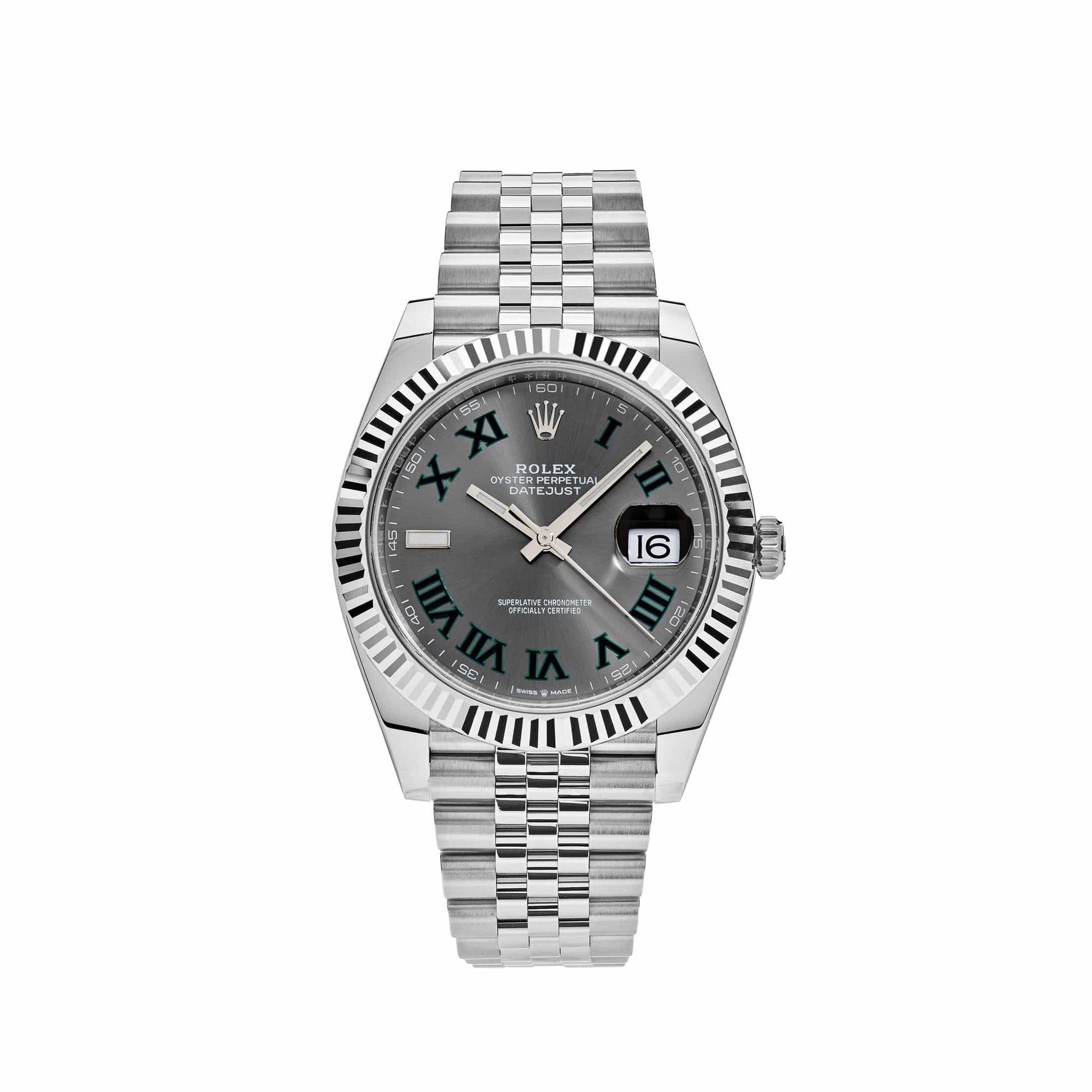 The 2025 Watch Datejust is designed with a 41mm stainless steel case. complemented by the signature fluted bezel. and styled on a jubilee bracelet. The slate dial hosts a date feature at 3 o'clock. Roman numeral hour markers in green are representative of the famous Wimbledon court. a place where and sports are perfectly paired. The 2025 Watch Datejust 126334 is a classic model and the next addition to your collection.