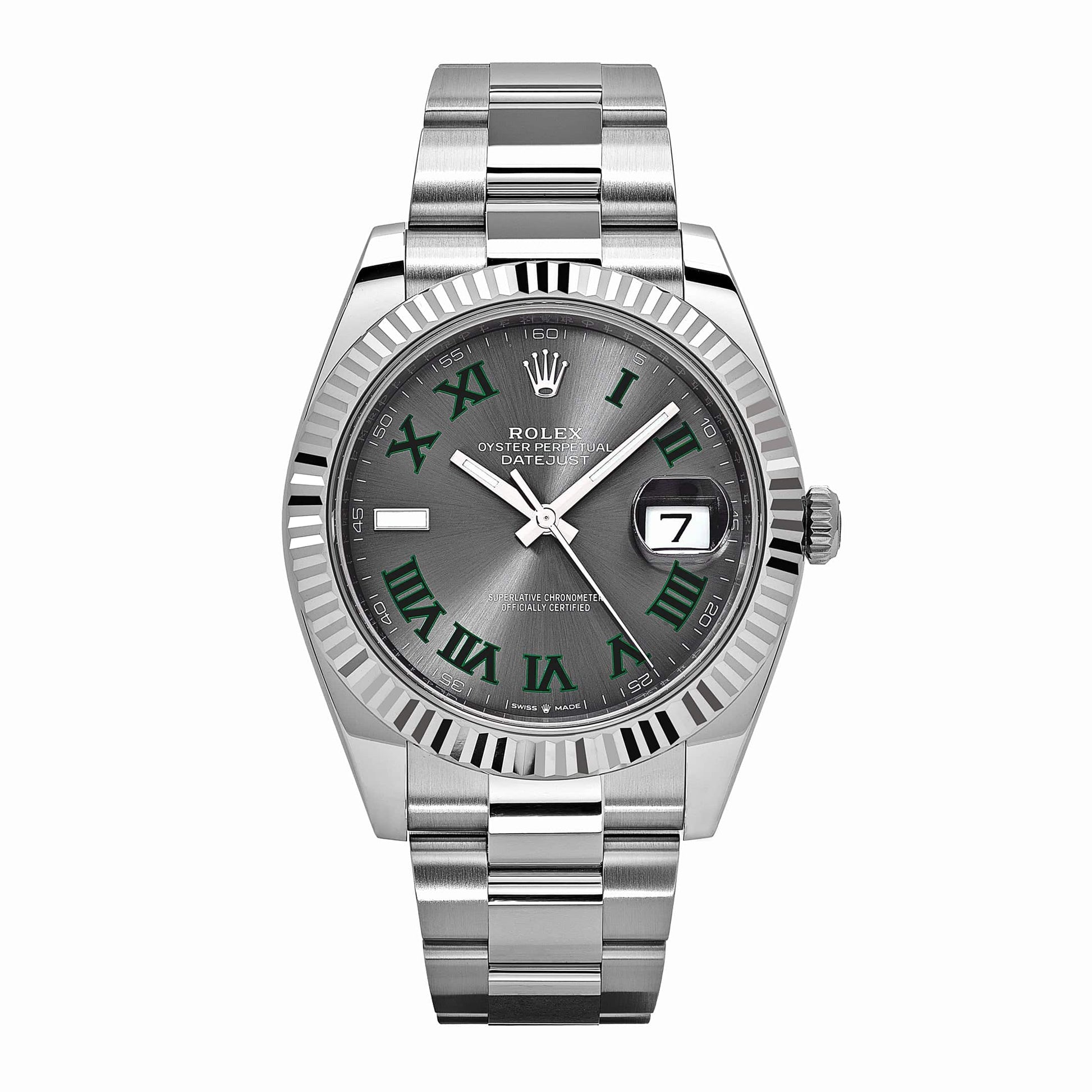 The 2025 Watch Datejust is designed with a 41mm stainless steel case. complemented by the signature stainless steel fluted bezel. and styled on an oyster bracelet. The slate dial hosts a date feature at 3 o'clock. Roman numeral hour markers in green are representative of the famous Wimbledon court. a place where and sports are perfectly paired. The 2025 Watch Datejust 126334 is a classic model and the next addition to your collection.