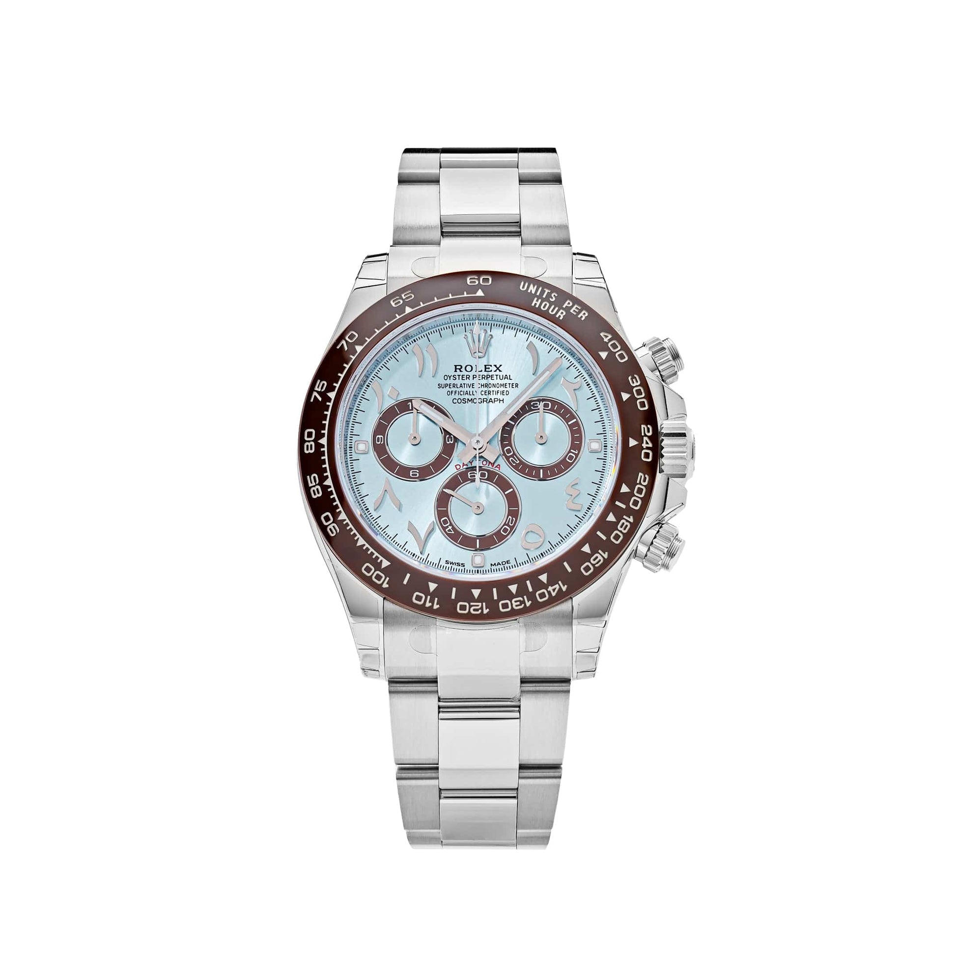 The 2025 Watch Daytona is crafted in a 40mm platinum case with a cool-as-ice. ice-blue dial. Features include sub-dials timekeeping and a tachymetric brown bezel. allowing the wearer to map out their track times with extreme precision. Luminous hour markers and hands doused with Chromalight allow for optimate legibility. Arabic numerals are positioned every hour. a special dial design that was released exclusively to Middle Eastern markets.