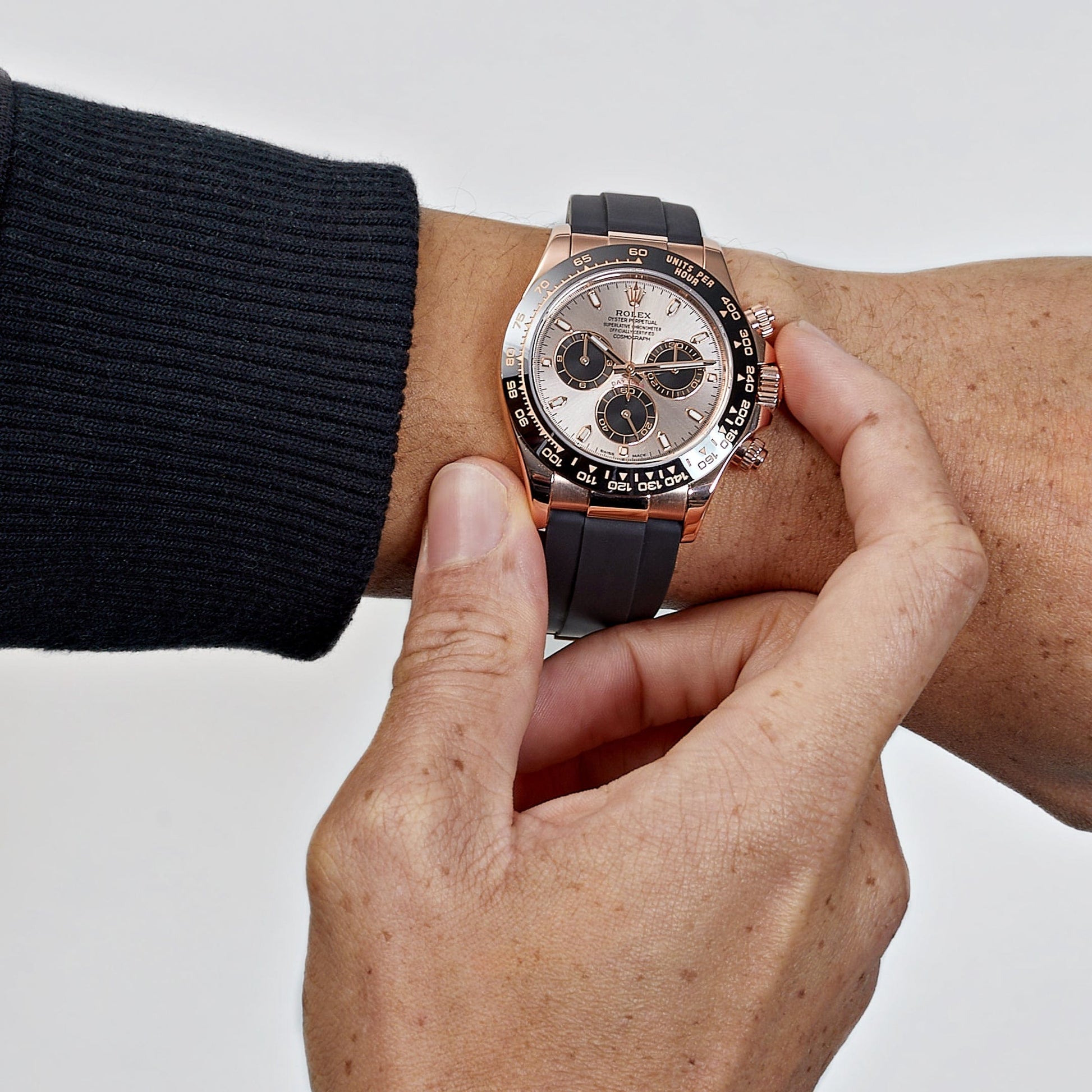 This 2025 Watch Daytona 116515LN?is designed in a 40mm 18k rose gold case. a ceramic bezel featuring?a Tachymetric scale. and a shimmering?sundust dial with black sub-dials.?The hour markers?and hands work with?Chromalight?display to provide optimal legibility. It is housed on a black rubber strap with a folding clasp. This 2025 Watch is the pinnacle between form. function. and fashion.