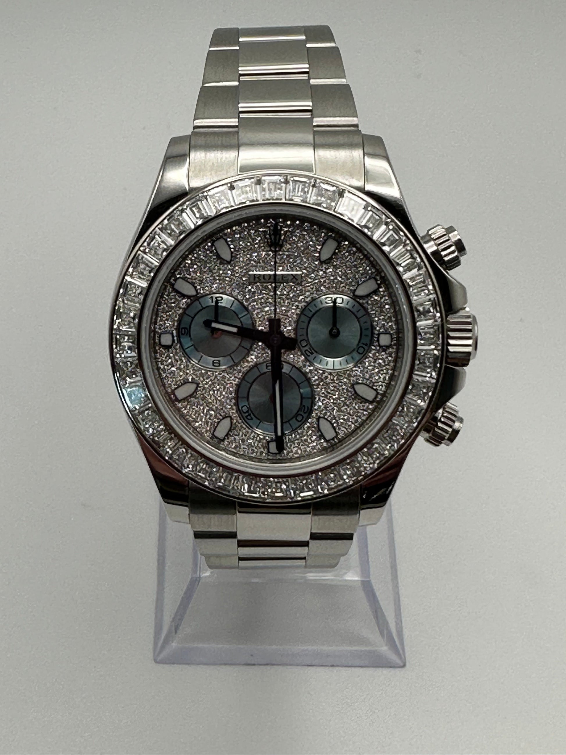 This 2025 Watch Daytona is crafted in a 40mm Platinum case and styled on a platinum oyster bracelet. The pave diamond dial hosts 437 round diamonds. ice blue sub-dials. and highlighted by a 36 diamonds set on the bezel. Functions include tachymeter and chronograph timekeeping. marrying a lavish lifestyle with top-grade technology.