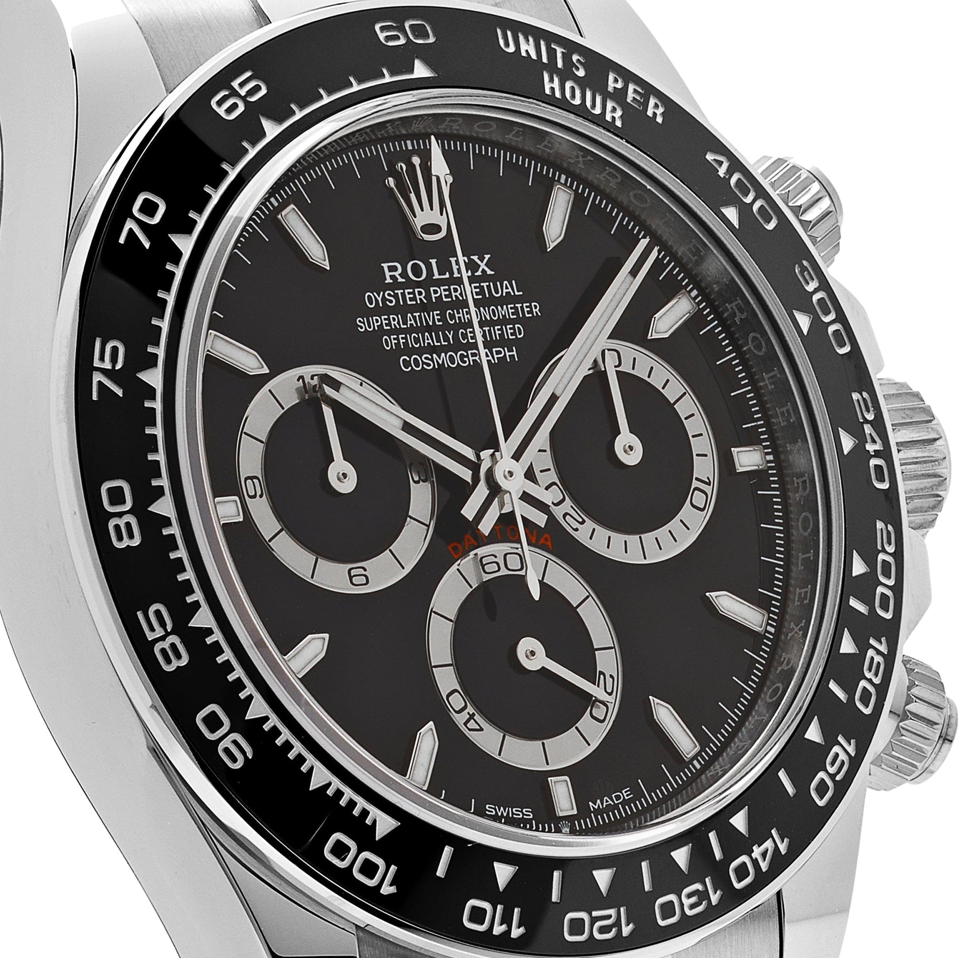 The 2025 Watch Daytona 126500LN is designed in 40mm stainless steel with a black dial and styled on an Oyster bracelet. Luminous hour markers and hands include a?Chromalight?display for optimal legibility. The black bezel is engraved with a tachymetric scale and hosts the high-performance Chronograph. Complications include a 30-minute counter. a 12-hour counter. and stop seconds for setting the exact time.?