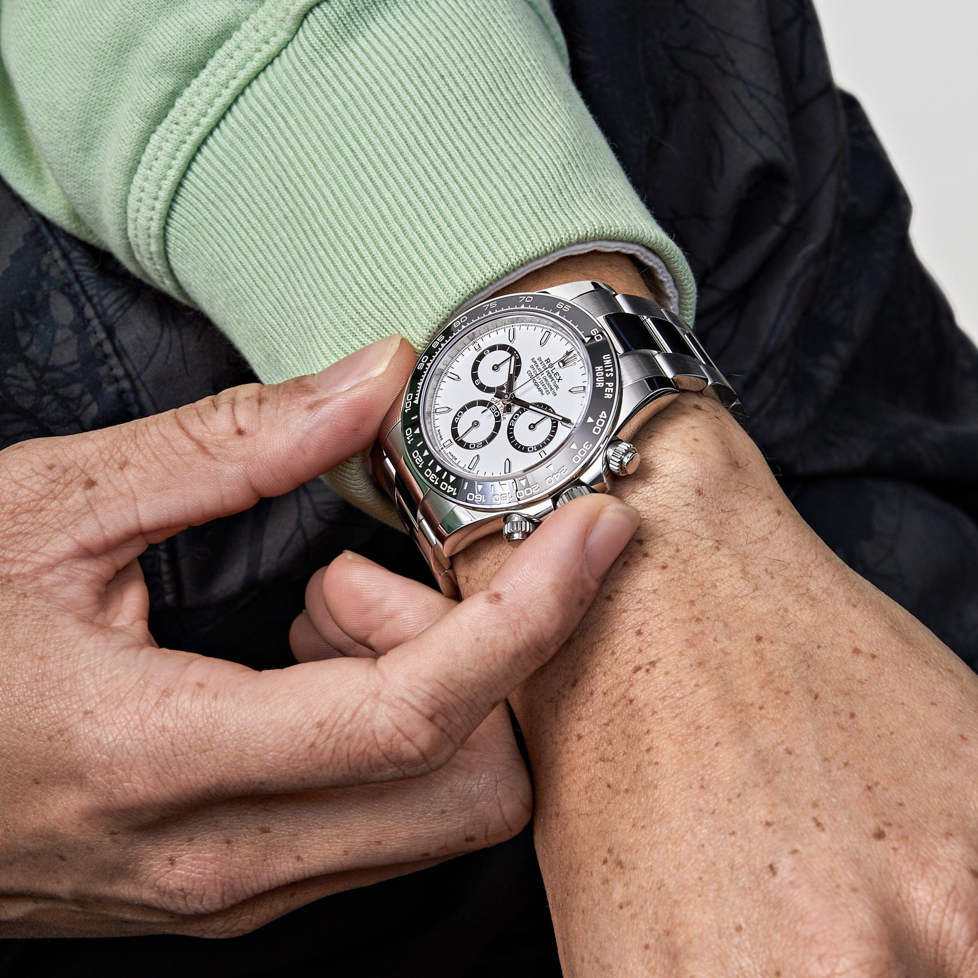 The 2025 Watch Daytona 126500LN is designed in 40mm stainless steel with a white?dial and styled on an Oyster bracelet. Luminous hour markers and hands include a?Chromalight?display for optimal legibility. The black bezel is engraved with a tachymetric scale and hosts the high-performance Chronograph. Complications include a 30-minute counter. a 12-hour counter. and stop seconds for setting the exact time.?