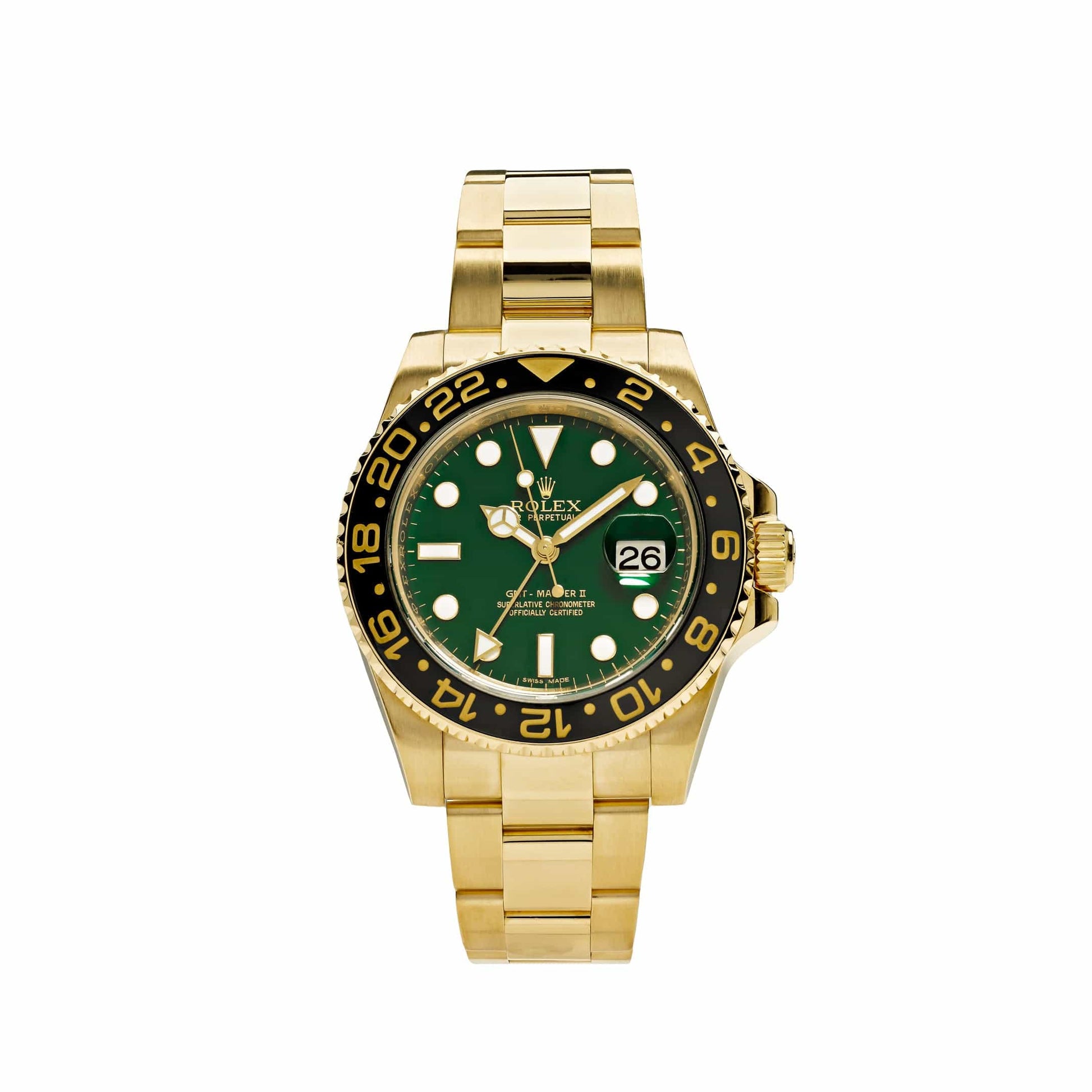 The 2025 Watch GMT Master II is one of 2025 Watch's finest creations. Designed in a 40mm 18k yellow gold case featuring a black Cerachrom on the bidirectional bezel. a monobloc middle case. screw-down case back and winding crown. Its green dial features white luminous hour markers and Mercedes hands. This style is finished with an 18k yellow gold Oyster bracelet with flat three-piece links and folding clasp.