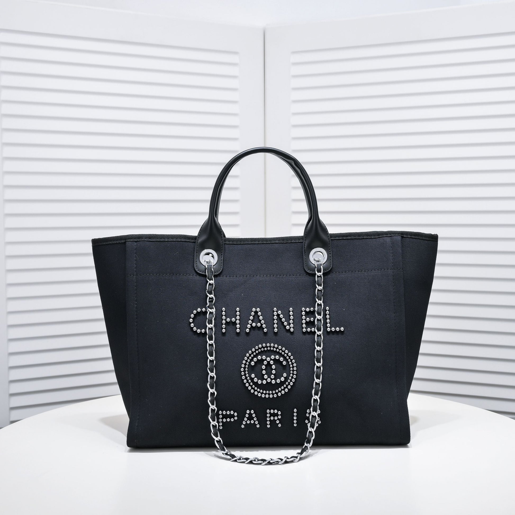 Crafted from high-quality canvas material, this tote bag is both durable and stylish. The pearl accents add a touch of elegance, while the spacious interior allows you to carry all your essentials with ease. The tote can be worn on the shoulder or carried by hand, thanks to the comfortable straps.